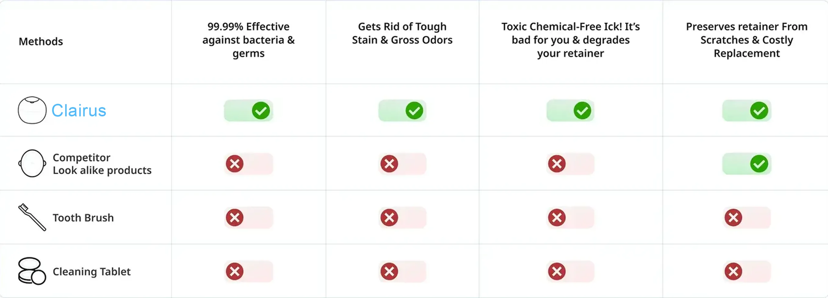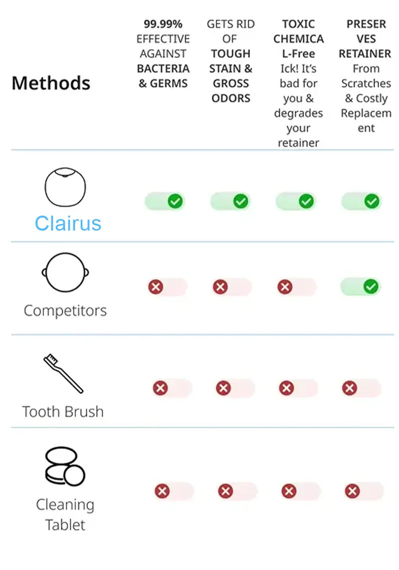 Simultaneously, Clairus emits UV light at a wavelength of 254 nanometers. This UV light effectively sterilizes your dental appliances, eliminating harmful bacteria, viruses, and fungi on the surface with the same sterilization technology used by hospital and airlines.